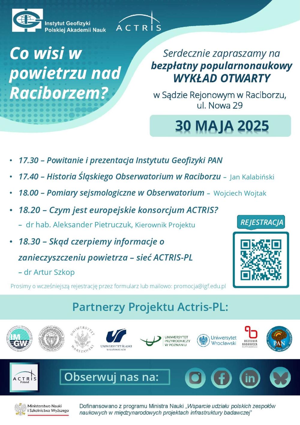 W programie wykładu znajdzie się również opowieść o ponadstuletniej historii Obserwatorium w Raciborzu. Od niemal wieku Instytut Geofizyki PAN prowadzi w nim stałe pomiary sejsmologiczne i atmosferyczne. To unikalna szansa, by zobaczyć, jak lokalny wkład przekłada się na ogólnopolskie i międzynarodowe badania naukowe realizowane tuż obok.