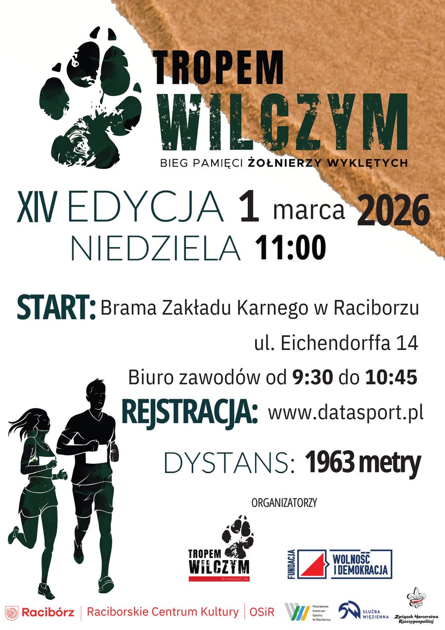 1 marca w Raciborzu odbędzie się XIV Bieg Tropem Wilczym. Start zaplanowano na godz. 11:00 spod bramy Zakładu Karnego przy ul. Eichendorffa 14, a uczestnicy pokonają dystans 1963 m. Liczba ta to odwołanie do roku, w którym zginął ostatni poległy w walce Żołnierz Wyklęty – Józef Franczak ps. Lalek.