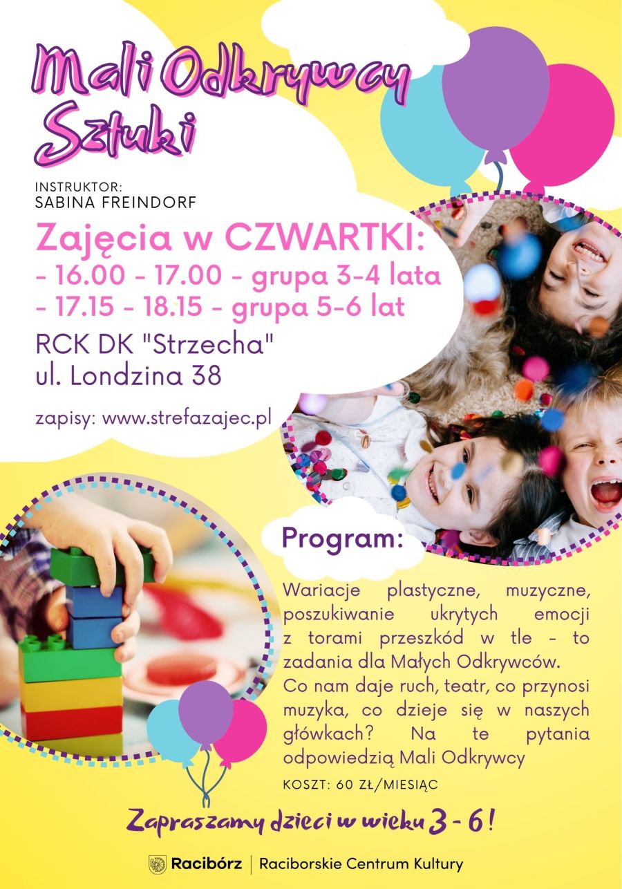 Raciborskie Centrum Kultury kontynuuje organizację zajęć artystycznych dla najmłodszych. Od października dzieci będą mogły uczestniczyć w cyklu spotkań pod nazwą „Mali Odkrywcy Sztuki”, które odbywać się będą w Domu Kultury Strzecha przy ul. Londzina 38.